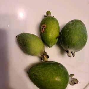 フェイジョアの実が生りました🙌 一本しかないため、自然受粉が難しく、花をチョンチョンして人工的に受粉し、今年は何とか4つ収穫出来ました😂味はキューイにレモンの風味を足したような爽やかな感じです☺️