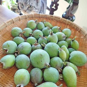6年目のフェイジョア、過去最多の収穫でした😊 でも摘果しなかったせいか実が小さい…ということを、帰省先の道の駅で売ってたフェイジョアを見て実感しました。 ちゃんと作ればあんなに立派なのが出来るんだなぁ~。来年がんばろ。