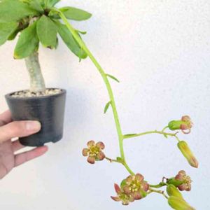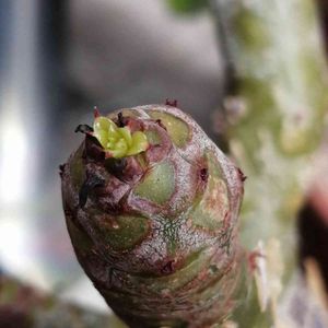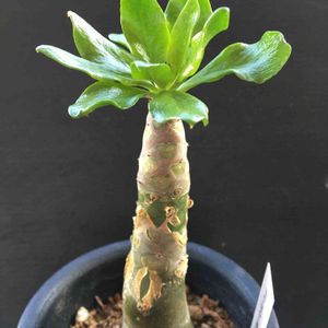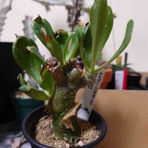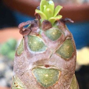 冬型のチレコドン・パニクラータ。 葉っぱの先端が枯れてきたので、そろそろ冬眠に入り始めました。 もう少ししたら涼しい日陰に移動かな🏃♂️💨 育成メモ: チレコドン・パニクラータ(阿房宮) Tylecodon paniculatus 冬 : 外OK(ベストは屋根下) 冬型 根塊種 水を溜め込めるので夏は完全に断水 秋は少しずつ水の量を増やしていく バオバブのような姿とめくれていく表皮が魅力 5月下旬から6月に葉っぱを全て落として冬眠する。日本では徒長しやすいので、冬眠直前に大きい枝の先端の成長線を少ーーしだけカットすると、目覚めの時に脇目を出して上じゃなく横に太りやすい。 10月中頃に冬眠明けの葉を芽吹きます。