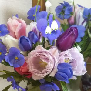 おはようございます😊✨。 昨日、近くの道の駅の お芋屋さんでおやつを買ったら 開店一周年記念とかで チューリップ4本の花束を 貰いました(^-^)🎵💗。 写真中央辺りの薔薇のような 花弁の縁が細かいギザギザに なっていて八重のチューリップ2本と黄色いシンプルな チューリップ2本💕。 初めて見る素敵なピンクのチューリップに庭で咲いた チューリップ、 アネモネ、ビオラ、 スノードロップを合わせて、 飾ってみました(^-^)💖。 今日も素敵な1日に なりますように✨✨✨✨💖。