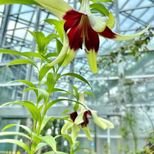 先日、大阪に行く用事があり時間があったので久しぶりにリリウム・ネパレンセに会いに行って来ました。 リリウム・ネパランセは和名ではウコンユリと呼ばれる品種でヒマラヤとその周辺地域(チベット、中国雲南省、ミャンマー、タイ北部など)の標高1500~2900mの高地に自生する野生種のユリです。 野生種のユリには珍しく花色が複色で花びらの先が黄緑色で中心部分が茶紫色をしているのが特徴的です。 和名の"ウコン"は、香辛料のウコンに因んでおり、花びらの先端の色から名づけられたと言うことです。 花姿はトランペット型ですが筒の部分が短く先端は大きく広がり反り返ります。 因みにこのリリウム・ネパランセとオリエンタル系のユリとの交配種のユリがオリエンタルリリークシマヤとゼバです。 咲くやこの花館にて 『🏷️2025年櫻鐵ユリコレクション』 『🏷️紛紅駭緑』