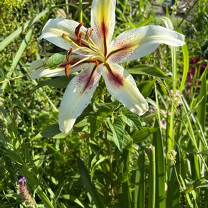 久しぶりにオリエンタルリリーサロンノに出会いました。 サロンノはオリエンタルハイブリッド系のユリとトランペット(オーレリアン・トランペット)系のユリとの交配により作出されたOTハイブリッド系の園芸品種のユリです。 花色はクリーム色に近い白で中心部が黄色く大型の部類に入るとても立派なホワイトリリーです。 ※OTハイブリッド(オリエンタルトランペット) 『🏷️太陽がくれた季節a』 『🏷️白輝美人』 『🏷️2025年櫻鐵ユリコレクション』