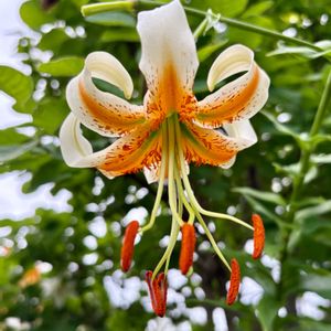 🔰カノコユリ(鹿の子百合)レディーアリスなる品種のユリに出会いました。 レディーアリスはキカノコユリ(黄鹿の子百合)とオーレリアンハイブリッド系との交配による園芸品種です。 花の形は花びらの先端が反り返るシャンデリアリリー型で白色の花に中心が黄橙色で清楚な花姿です。 『🏷️太陽がくれた季節a』 『🏷️白輝美人』 『🏷️2025年櫻鐵ユリコレクション』