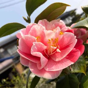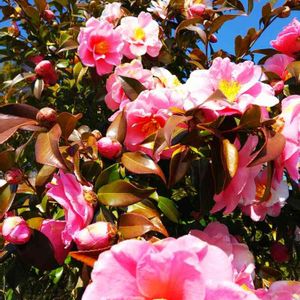 今日のお花🌼🌼 山茶花💠💠昨日のpicです 🏷️には我が町久留米生まれのハルサザンカ「絞り笑顔」となってましたが白い斑が入ってない⁉️ただの「笑顔」でしょうか⁉️ 右下↘️は白い斑がはいってました☺️ 久留米市石橋文化センターにて