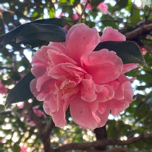 《桜鏡》という名の春山茶花。 八重の花が背中側にも付いていて 🌸の合わせ鏡のようでした🤗 山茶花と椿のMIXが、春山茶花だそう💞