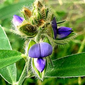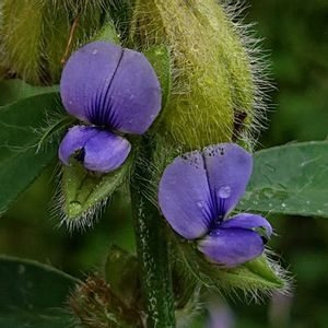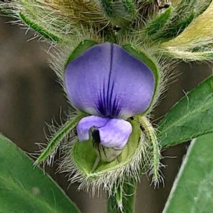 狸豆(タヌキマメ) マメ科タヌキマメ属の一年草。日当たりがよくやや湿ったところに生える。茎や葉などに褐色の長い毛が多い。葉は広線形。花期は7~10月。花は枝先に総状につき、青紫色で長さ約1㎝。萼は大きく、褐色の毛が密生してよく目立ち、深く2裂し、さらに上裂片は2裂、下裂片は3裂する。花は午後開いて夕方にはしぼむ。花は10~20個くらいつくが、開花しているのはたいてい1つか2つだけ。花のあと萼は大きくなり、豆果をすっぽり包む。豆果は長さ1~1.5㎝の長楕円形。 名前は、褐色の毛に覆われた萼を狸に見立てたという説のほか、正面から見た花の姿や萼に包まれた豆果が狸の顔に見えることからつけられたともいう。果実の形を狸の睾丸に見立てたとの説もある。 出典『野に咲く花』『秋の野草』『薬草の呟き』