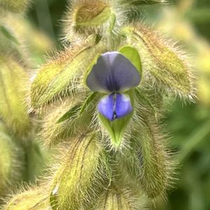 タヌキマメ(マメ科) タヌキマメ属 隣町の観察会に花友さんと出かけました‥🚙 はじめに、会員の方から~ワクワク情報のご紹介があります‥💞 ② その1つがコチラ~鉢植えのタヌキマメです‥🦫 お花はGSで知ってはいましたが~実際に見るのは初めてでした。 マメ科らしからぬ葉っぱは、1枚の「単葉」で広線形~葉のみの時期にはマメ科の植物とは思えない姿をしているのですね‥😲!! ネムノキやクズなどの他のマメ科植物と同じように~夜間には葉を立てるようにして茎にそって眠るそう‥💤シュウミンウンドウ!! 朝、9時過ぎ~花が咲いていませんでした‥👀!! 「観察会が終って戻って来る正午頃には花が咲くと~~~」言ってましたケド‥🙄?! 長い毛に覆われた萼の中に入っていて。。。開花の気配は感じられませんでした‥🤔?? ︙ ① そしてお昼、咲いていました‥(*^^*)🎶💙💚 花期は7~9月、茎上部あるいは分枝した枝先の総状花序に、直径1cmほどの青紫色の蝶形花を咲かせます~旗弁基部中央には濃紫色の筋があり、左右の翼弁基部には白斑があります。 * 千葉県では、個体数が少なく要保護生物(c)になっています。