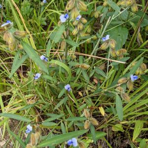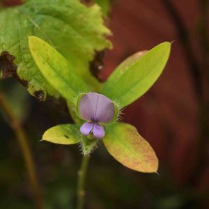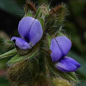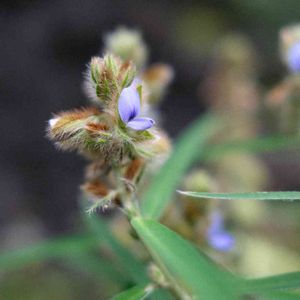 狸豆(タヌキマメ) マメ科タヌキマメ属の1年草。日当たりがよくやや湿ったところに生える。茎や葉などに褐色の長い毛が多い。葉は広線形。花期は7~10月。花は枝先に総状につき、青紫色で長さ約1㎝。萼は大きく、褐色の毛が密生してよく目立ち、深く2裂し、さらに上裂片は2裂、下裂片は3裂する。花は午後開いて夕方にはしぼむ。花は10~20個くらいつくが、開花しているのはたいてい1つか2つだけ。花のあと萼は大きくなり、豆果をすっぽり包む。豆果は長さ1~1.5㎝の長楕円形。 名前は、褐色の毛に覆われた萼を狸に見立てたという説のほか、正面から見た花の姿や萼に包まれた豆果の様子からつけられたともいう。果実の形を狸の睾丸に見立てたとの説もある。 出典『野に咲く花』『秋の野草』