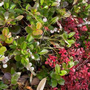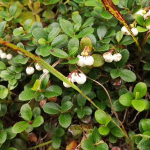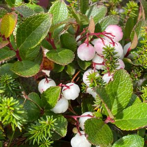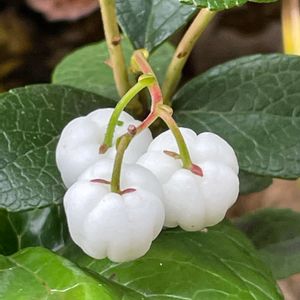 シラタマノキ ツツジ科シラタマノキ属 常緑小低木 同属のアカモノの果実は赤く、シラタマノキは白い果実をつけるのでシロモノと呼ばれますが白い実は珍しいですね🎶 紅葉した葉に埋もれた白い実は白玉団子のようですね😊💞 食べられるのでしょうか?🍡💗