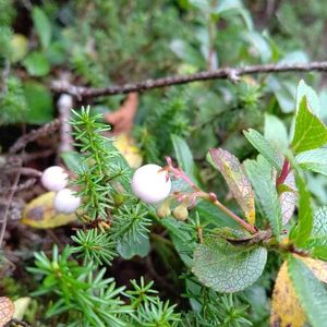 シラタマノキ(白玉木) 果実 *ツツジ科シラタマノキ属 花期は6〜7月 果実期は9〜10月 中部地方以北の亜高山帯以上の乾いた岩地などで見られる常緑小低木。 この果実は、筋肉疲労などの塗り薬でも使われる「サロメチール(サリチル酸)」の匂いがします。昨年初めて体験して、とても不思議でした。 仙台市野草園