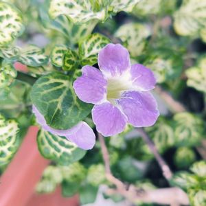 ニチニチソウと一緒に買っていた斑入りの葉っぱが魅力だった 赤道サクラソウ‘レティクラタ’ インド~マレー半島原産の這い性 網目模様の葉っぱに淡紫色が爽やかです コロマンソウやチャイニーズ·バイオレットの名前でも呼ばれてるそうです