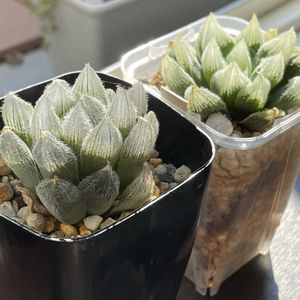 今日は植え替え日和でした😊 蚊さえいなければ良い感じの気候 【チーム👯🕺ハオルチア黒砂糖】です! 下は標準仕様☝️ 左と2枚目は斑入りの黒砂糖錦🫥 右と3枚目は黒砂糖芽変わり🍃 おまけの4枚目は鉢上げしたラブハート🫶意外と大株 外管理ビニールハウスの皆様でした👏