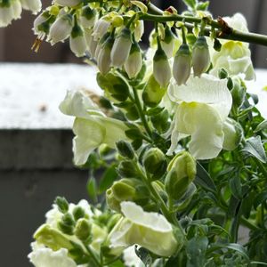 白いお花の🏷コラージュ仲間達😄 ブルーベリーの鉢に金魚草の種が落ち花咲きました😄