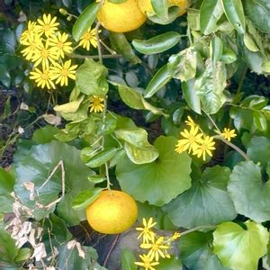 【季節の風物シリーズ;蜜柑と石蕗】 📝直ぐ近所の売り出し中の空き家の庭に🍊蜜柑が沢山成っており、その下の方には石蕗:ツワブキの黄色い花が満開に咲いていました。 《一歌献上》 「みかん成り 石蕗の咲く売り出し家」 @訳意:This is the garden of a house for sale, where tangerines are plentiful and butterbur flowers are in full blooming. 🗒️ The yellow coloer’s combination of the oranges and the butterbur flowers were so beautiful. ✍️Works;Poetaster Kazyan Doe.,/;筍歌人;藪中和堂 🖼️Artistic;Mandarin oranges and butterbur flowers December 4,2025:past 14:30’;📱shooting December 5,2025:past 00:00';upload by Kazyan’s Green Studio