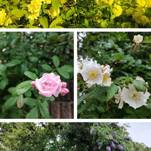 この前まで見頃だった裏庭のモッコウバラ🌹 ピンクの八重は群舞。 白はノイバラ。 🌹の季節が始まりました。