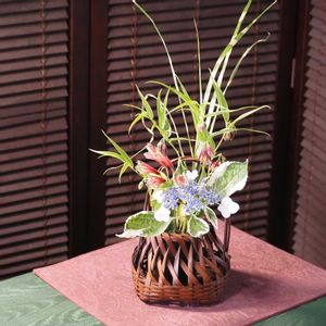 花寄せ𓂃花籠 ✼斑入り葉紫陽花 ✼原種アルストロメリア ✼唐竹蘭 ✼矢筈ススキ 庭の花便り𓂃𓂂𖡼.𖤣𖥧𓈒◌܀✉🕊𓂃 🏷あっ火曜日 🏷真っ赤な火曜日