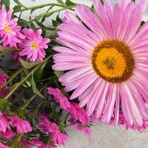 《今日のお花》 切り花用アスター宴✨️︎💕︎︎ 種袋の裏面も見ずに、アスターというだけで購入して種まきしたら… なんと花の大きさ5cm💦 今朝、咲いてる花を2度見👀‼️ (こんなん植えたっけ⁉️) 隣の小さなジュエリーアスタークイーンと比較で並べてみました😂 知らないって怖い😂 でも、大輪で凄く綺麗で気に入ってしまいました❤️ また来年も種まきしようかな🎶