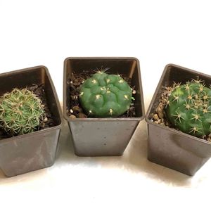 寄せ植え側、手前62、左奥68、右奥72。 日当たりと風通しの良い屋外で基本野ざらし放置。 我が家の黒プラ鉢、手前33、左奥69、右奥71。 夜と雨降りの時のみ簡易フレーム温室内、それ以外は出来る限り風通しと日当たり(9時から14時くらい)が良い場所で平置き。 ギムノのみ年中簡易フレーム温室最上段。 春と秋は液肥入り水道水、時々雨水を溜めた物で潅水。 数が近いほど近い時期にお迎えしているので、手前のペンタカンサか(ギムノの)ホルスティかって雰囲気の子はお迎え時期が離れていますが、奥側二つずつは同時お迎えです。 左奥はマミラリアでお迎え当時とても似ていたけど、投稿準備中画像をよく見たら棘の数が違うので、違う品種なのかもしれません。 右奥はミニサボの札で、こちらはおそらくパロディア(旧ノトカクタス )の獅子王丸かその近縁種ではないかと思います。 全体的に我が家の方が大きいのですが、日当たり具合の違いからか、雨水の力か、寄せ植え側は小さいなりにギュッと締まって色もよく、棘に野性味を感じます。 獅子王丸と思われる子は、強い光と風が好きなだけあって、ずーっと屋外で育てるとこんなにカッコイイ棘になるんだな〜って感じです。