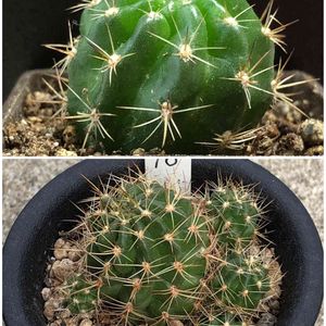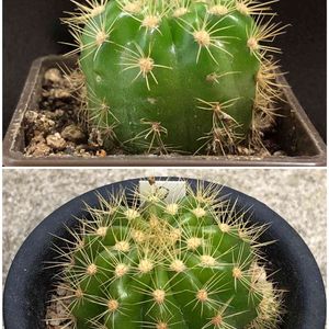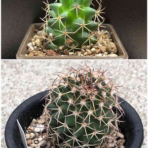 ダイソーサボテン 経過観察 9番(一年後) 上はお迎え当時、下は現在の姿です。 ミニサボテン札で昨年10/9お迎えしました。 まだ花芽は吐いたことがありません。 全体的に大きくなり、稜が増えたり子吹きしたりしています。 多分、エキノプシス属の金盛丸かな〜。 【Dサボ経過観察シリーズ 中抜け番の行方】 6番は柔肌カギ棘種のマミでしたが、お迎え早々調子を崩し(昨年9/22投稿)、水耕を試みてる最中(10/12投稿)にうっかり高い位置から落としてしまい、その衝撃がきっかけとなったようで、溶け落ちてしまいました。 7番はお迎え当時1番と見た目が近く(昨年9/18投稿)、育った今見比べると半年経過で8/30投稿の47番と同種と思われます。 8番は6番とは違う柔肌カギ棘種のマミでした(昨年10/11投稿の左端真ん中)が、移動中棘を服に引っ掛けて抜き落としてしまった事に気付かず歩いてしまい、☆となってしまいました。