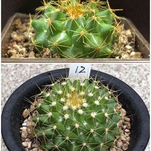 ダイソーサボテン 経過観察 1番(一年後) 左がお迎え当初、右が現在の姿です。 マミラリア札で昨年8/26にお迎えしました。 まだ花芽は吐いたことがありません。 お迎え前の部分は若干廃って、お迎え後に育った部分は縦に伸びがちですが、少し径が増えました。 いくつか似た子をお迎えして育てた結果、別品種かも?な姿の子がいます。(次投稿) ん〜、マミラリア属のマツダエに似てるかな?