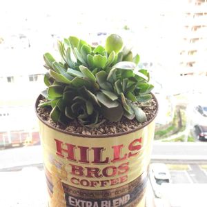 鉢が小さくなって根が 下から出てきていたので 業務用トマト缶サイズの 珈琲缶に植え替え(∩´∀`∩)