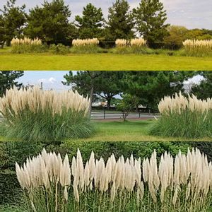 パンパスグラス🌾 パンパスグラスの基本情報 和名:シロガネヨシ(白銀葭) 科名:イネ科 属名:シロガネヨシ属 パンパスグラス パンパスグラスは、庭植え用の苗として流通するほかに、秋に切り花としてもたくさん出回ります。庭植えのものを切り花として利用する場合、花穂が出る前の棒状のさやをナイフで削って、強制的に若い花穂を露出させると、光沢があってきれいです。ただし、葉の縁がノコギリ状になっているので、手を切らないよう、取り扱いには注意しましょう。 パンパスグラスは、南アメリカとニュージーランド、ニューギニアに分布するススキに似た多年草で、約20種が知られています。栽培されるのは、明治中ごろに渡来したセロアナ種(Cortaderia selloana)です。雌雄異株で、雌株の花穂には長い毛があり、観賞価値が高くなります。 タネまきと株分けでふやせますが、タネをまいて育てると、穂が茶色でやや細い雄株も混じります。 耐寒性は強くなく、-2~-3℃程度です。地中まで凍ると傷むので、若苗は凍らせないように防寒が必要です。寒冷地では大株でも防寒しないと、株が弱ります。 パンパスグラスの基本データ 園芸分類:草花,グラス 形態:多年草 原産地:南アメリカ、ニュージーランド、 ニューギニア 草丈/樹高: 1~3m 開花期: 9月~10月 花色: 白,ピンク 栽培難易度(1~5) 耐寒性 : やや弱い 耐暑性 : 強い 特性・用途 : 初心者でも育てやすい ✧パンパスグラスの種類(原種、品種) ①ホワイト・フェザー Cortaderia selloana ‘White Feather’ 草丈3m。大きな庭でないと栽培困難。白い花穂が切り花に利用される。雌雄異株で、タネでふやす。 ②ピンク・フェザー Cortaderia selloana ‘Pink Feather’ 草丈3m。‘ホワイト・フェザー’同様、大型で切り花向き。淡いピンクの花穂をつける。雌雄異株で、タネでふやす。 ③斑入り Cortaderia selloana 特に寒さに弱いので、防寒はしっかり行う。草丈は1m程度と、パンパスグラスとしてはコンパクト。
