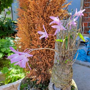 ご近所さん家の庭で ピンクのセッコクがあったので、撮らせて頂きました~ 何年もなるけど、初めて咲いたと言ってました。 後ろの枯れたコニファーが、邪魔でしたね😅
