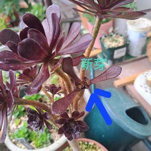 おみやげで貰ったたった1鉢の黒法師 1ヶ月位前にチョンパして見た さっき覗いたら赤ちゃん出てました~ 暑い中上手く育ってくれるかなー 2枚目の鉢にチョンパしたやつを置いてみたけど、まだ根付いて無いです💦