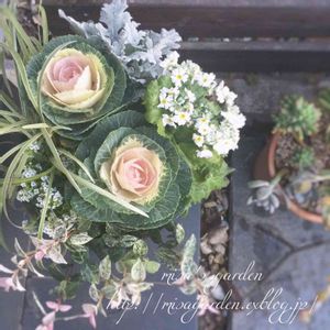 こちらは、少し大人に仕上げた葉牡丹の寄植えさん╰(*´︶`*)╯♡ 子供の頃は、葉牡丹ってキャベツかと思ってた(笑)
