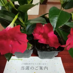 豊明市場×GreenSnapオリジナルブランド「三ツ星品質」モニターに当選し、サマーラッシュというマンデビラの新品種が2ポット届きました🎵\(^o^)/🎶 選んでいただき、ありがとうございます❣️ 紅白の2色なのも縁起がいいです❗😃✨ 今日は天気が雨🌧️と雷⚡なので、後日天気のよい日に鉢に植え替えて、また投稿したいと思います。😊 モニター投稿①