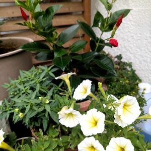 今日のお花 キンギョソウ 本日仲間入りしたてです ②ペチュニアさんも新入りさん 渋い色合いです✨ ③白花ルリマツリ 沢山咲き始めましたが… 落ちた花ガラが🐕️に絡みつき厄介です ④モニターのお花をとりあえず鉢に植えました 赤花はチョット工夫しようかと…