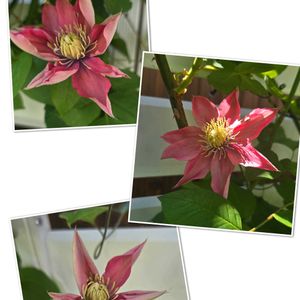 こんにちは😊 1枚目クレマチス リトルマーメイドが咲きました🌸長いツルが取れてしまい花が下にばかり咲いてしまいました😓新しいツルも伸びてきてますから切らない様伸ばしていきたいです😊 2枚目 クレマチス美登利です グリーン色の花ですが咲き進むに連れて中心が白く花弁の先はほんのりピンク色です🩷 どちらも早咲きの大輪ですが美登利の方が花持ちはとても良いです🤗 🏷️金曜日の蕾たち 🏷️蕾組の子 🏷️人に優しく 🏷️コラージュ仲間達に参加します🌸
