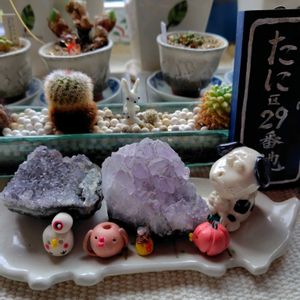 🏷️石の日 大好きな アメジストの結晶 で参加します。 石っぽい ピータン達と ②葉挿しの 上に真ん丸葉っぱ🤣 ステファニアの葉っぱ でした~