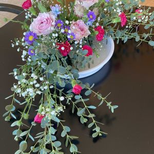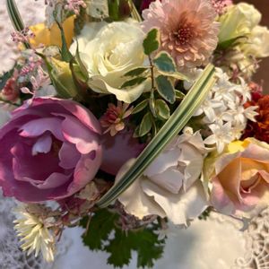 今週のフラワーアレンジメント*ポエティック* 使った花材は ユーカリ、バラ、スプレーカーネーション、クジャクソウ、カスミソウ、アストランティア、ブルースター、アリウムです ユーカリでアウトラインを決めてから花を挿しました 2枚目は反対側から撮影 優しい色合いが気に入っています♡ ドジャース勝てるといいですね⚾️