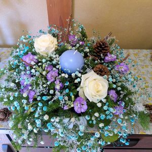昨日のフラワーアレンジメントレッスン Tiene: Blue étoile ブルーエトワール (青い星) テキストのお手本は青いデルフィニウムですが💙ブルーに染められたカスミソウです。 全体の寒色系に💗赤紫色のストックがアクセントになってます🤗