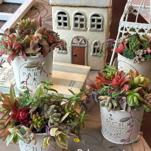 ①今日の花遊び教室は、多肉植物の寄せ植えをしました。 ②好きな多肉を好きな感じでさして頂きました。 ③ミニブーケも自由な感じで。 ④花瓶で飾れそうな庭の花を切って、準備しました