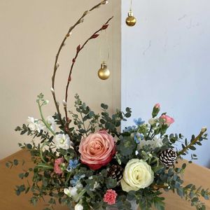 今週のフラワーアレンジメント *↟⍋*↟パウダースノーツリー*↟⍋*↟ 静かにきらきらと舞う粉雪の風景をイメージして… とアドバイスにありました 白いストックが枝に積もる雪のようですね❄️ ユーカリが大量にあり、ちょっともっさりしたかなあ… 🏷️クリスマス月間 参加させてください🎄