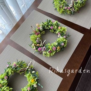 ①今日の花遊び教室の作品 小花がこぼれる感じの、この角度がとっても可愛く作って頂きました。 ②ミニひまわりがたくさん咲いていたので、おしゃべりしながら、私もリース作りが出来ました😊 ③後ろ側も可愛かったので、前からと後ろからをセットに。 ④2つ並べてみると、豪華になりました🤭