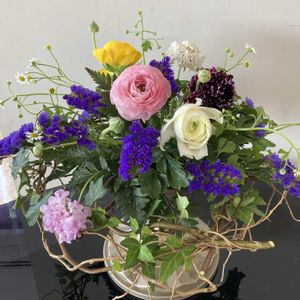今週のフラワーアレンジメントレッスン🎶ワルツ🎶 いつものコースは難しそうだったので子どもアレンジをチョイス♡ ラナンキュラス、スカビオサ、マトリカリア、スターチスが春のワルツを奏でていたらいいな♪