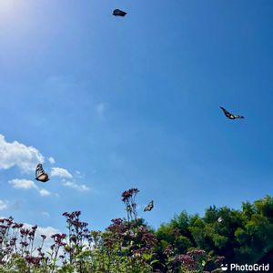 「旅する蝶・アサギマダラ🦋呼び寄せ大作戦‼️2年目・2025シーズンpart21」、日最大飛来数記録を更新✌️。 今週火曜から、仕事昼休みに一時帰宅🚙💨しての滞在10分間の🦋観察、職場へのトンボ返りを敢行しているが、日毎に6頭、6頭、8頭と増え、ついに今日は昨年記録した日最大9頭超えの飛来数15頭を記録😃。 全てマーキング無し個体で、どこからやって来たのか知りたい思いは募るばかりだが、めっちゃ嬉しい😊。 青空☀️バックに、スクエア+1編隊飛行✈️をパチリっ🤳。 明日からの3連休、果たして何頭まで伸びるかな?🤔