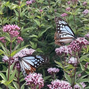 「旅する蝶・アサギマダラ🦋呼び寄せ大作戦‼️2年目・2025シーズンpart18」、妻からのLINE📱を見たら居ても立っても居られず・・・。 今朝、今シーズン初の複数頭・2頭を確認し、喜んで出勤し仕事をしていると、妻から「たくさん居るよ」のLINE📱。 我慢出来ずに昼休みに一時帰宅してみると、6頭🦋🦋🦋🦋🦋🦋を確認😍。 フジバカマが60株程あると、全面に🦋分散し、蜜を吸っている個体や飛んでいる個体もいて、全てを同時に上手く撮れない🤳のが悔しい😣。 フジバカマ💖🤍は満開前のいい状態、昨年記録の日最大9頭超えも近いかも?🤔 昼休みを使った滞在10分間の一時帰宅、これからしばらくの日課になりそう^_^💧。