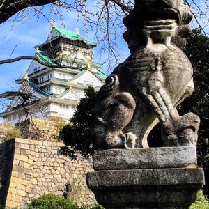 日中友好のため大阪市に寄贈された明代の中国狛犬と大阪城 大きくて威厳のある狛犬です。 上部の桜はまだつぼみです。