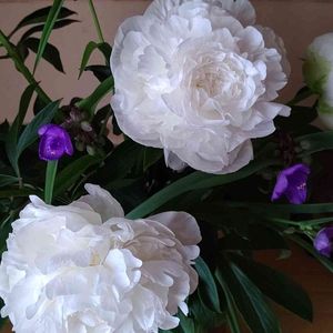 大好きな 芍薬 真っ白 GET ! シャクヤクと 紫色の露草を合わせて😍😍 切り花楽しむ 👍️👍️ 自己満足 (笑)🤭