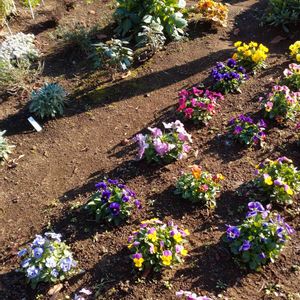ビオラとダリア😊 落ち葉を片付けてきれいになったところでせっかくだから🤳📱😊 公園にはまだまだ落ち葉があるので…🍂流れて溜まるのは仕方ないね😅 2022,12,10 🟦 🟨🕊️🕊️🕊️🕊️🕊️🕊️🕊️