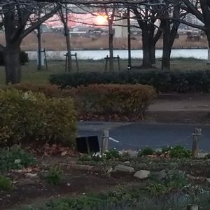 東の空の夕陽? 夕方の花壇で、ふと見れば…👀‼️ 川向こうの東に沈む太陽が…💦🤔? ちょうどいい高さで…夕陽に反射したビルが光ってました😲😁😄👍 この時間まで作業をすることがないから、初めての面白い景色に出会いました😍💕👍 2023,1,3 🟦 🟨🕊️🕊️🕊️🕊️🕊️🕊️🕊️