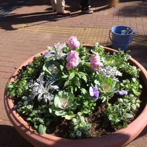 ガーデンサポーター活動☘️ 公園入口の巨大プランターの植え替えのお手伝い。 ストック、パンジー(青紫)、ビオラ(黒)、ミニハボタン、シロタエギク、スイートアリッサム。 春には周りのスイートアリッサムがプランターから垂れるようにイメージして植えましたー😊