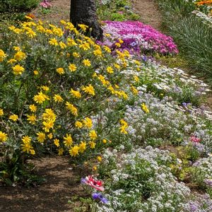 チューリップが終わって、ユリオプスデージーが咲き始めました🤗 アリッサムがこぼれ種でいっぱい🤗 真ん中の八重桜が散り始めたら、この中は雪が降ったみたいにもっと真っ白になります😅 2025.4.22