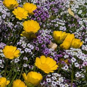 🟡ムルチコーレ 🟣⚪️アリッサム 花屋でムルチコーレを見つけられないので、昨秋に種まきしたら順調に育ってウレシイ ヾ(。>﹏<。)ノ゙✧*。 こぼれアリッサムが今年はモリモリ〜 ヾ(。>﹏<。)ノ゙✧*。 来年は両方こぼれ種で決まりだ〜😆👍️💕 2025.5.8