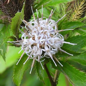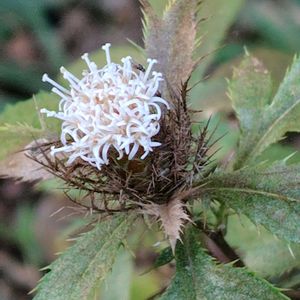 オケラ(朮) キク科オケラ属の多年草 9-10月 近縁種とともに生薬として用いられる。 また若芽を山菜として食用にもする。 地域: 本州-九州 地方名: ウケラ、カイブシ、カイブシノキ、カイブシコケラ、ウワオロシ、オケラッパ、エヤミグサ。 田の中に住む虫のような名前だが、万葉集の時代にはウケラとして親しまれ、これが転じてオケラとなった。 特徴: ◦枝先にアザミに似た白い筆のような小花を咲かせる。花の外側にある「総苞葉」が細かく切れて針状になるのが特徴。 ◦雌雄異株。 雌花と両性花があります。 ③の画像: 両性花、葯筒から長い花柱が突き出ています。 ◦葉は楕円形で、縁にある細かなギザギザはトゲ状になる。表面は艶があるが、裏面は綿毛に覆われて白い。一見すると葉や茎が硬くて食べられそうもありませんが、春先の若芽が美味しいらしい。