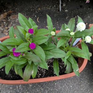 モニター報告✌️ センニチコウ ミッテ😍 定植後45日くらい経過😄 花が真ん丸で無く俵形になって来ました😀 赤い花は蕾が枯れ始めました😂